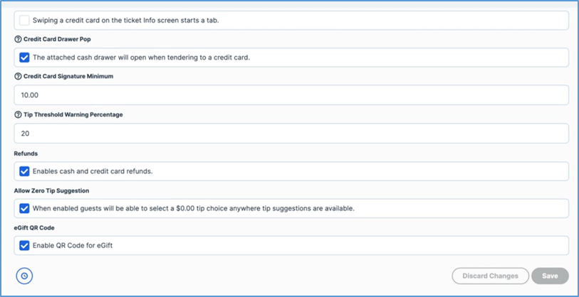When the pre-auth amount is exceeded, the POS will automatically pre-authorize the card again for this amount. For example, you might set the Pre-Auth Amount to $10, and then set the Additional Auth Increment Amount to $5. In the POS, when you open a new credit card tab, the POS will pre-authorize the card for $10. If, after adding items to the ticket, the total exceeds $10, the POS will then pre-authorize the card for an additional $5, bringing the tab’s pre-authorized maximum of $15. And so on. - Click Save.