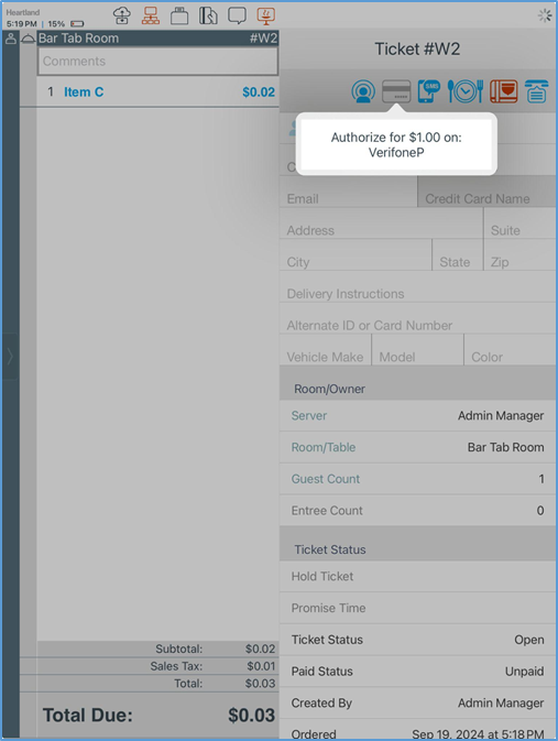 Once approved, the POS applies the pre-authorization to the ticket. You can now order additional menu items or otherwise modify the ticket. Should the ticket’s total exceed its pre-auth amount, the POS will try to add an incremental authorization for the amount specified in the room’s settings. - When you are ready to close the ticket, tap Checkout.