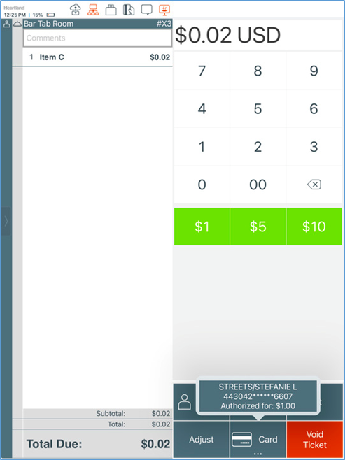 - The POS verifies the card’s funds for the tab’s final subtotal (before a tip is added) and automatically increments the initial authorization.