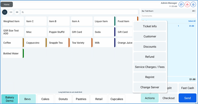 - In the Order screen, in the Ticket panel, tap Actions.
