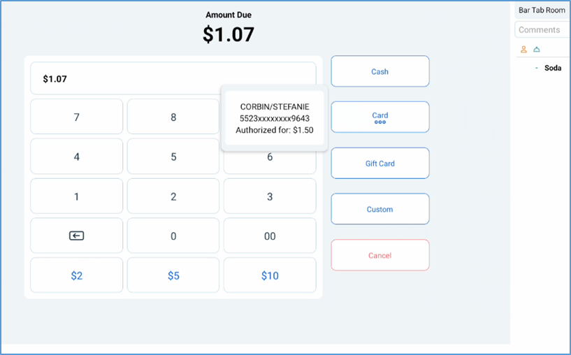 - The POS verifies the card’s funds for the tab’s final subtotal (before a tip is added) and automatically increments the initial authorization.