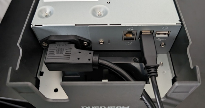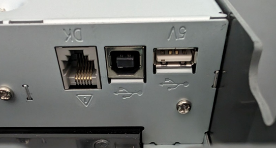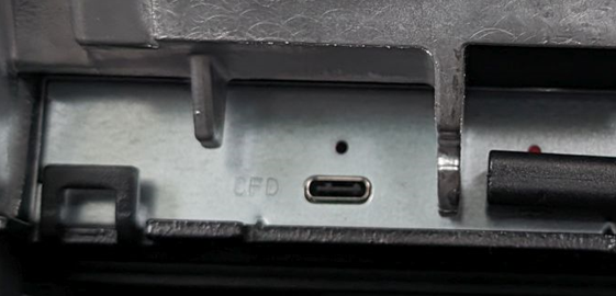 This will reveal a USB-C printer port labeled CFD. - Plug the CFD’s power cable into the CFD printer port.