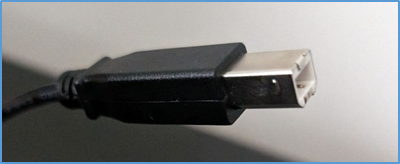 The data cable features a USB-B connector on one end and a USB-A connector on the other end. - Plug the USB-B end of the data cable into the printer’s USB-B port.