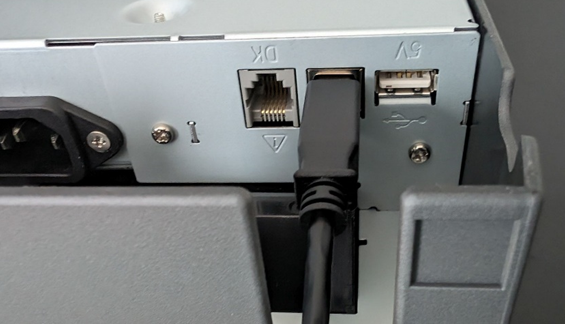 Under the printer, along its back side, you will find a collection of ports, including an Ethernet port, a USB-B port, and a USB-A port. You will also find the port for the device’s power cable. - Find the device’s data cable.
