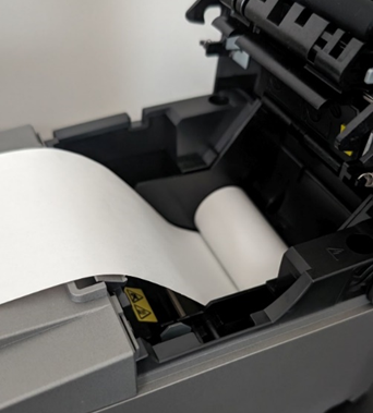 - Insert the printer’s paper roll in the device, unrolling it from the bottom out over the front of the device.