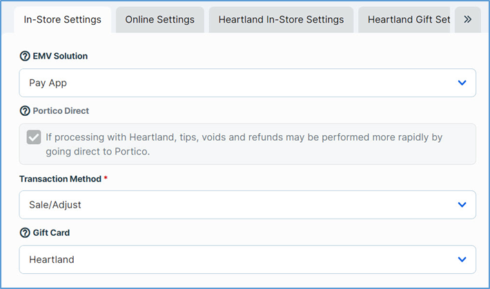 - In the Payment Gateway screen, on the In-Store Settings tab, select Heartland in the Gift Card list.