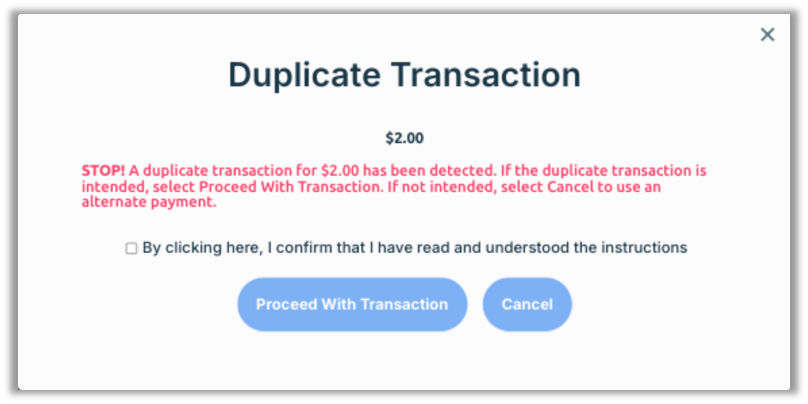 - If the transaction is valid, select Proceed With Transaction to override the duplicate transaction warning and process the payment.