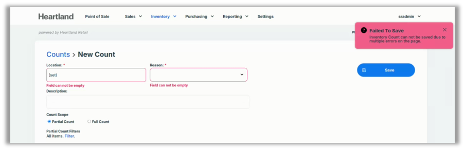 We have made changes to ensure that messaging and field notifications in the New Count flow are consistent with those in other modals. If required fields are left blank, the modal will display a red alert in the upper right corner, and will outline any such fields in red with a notification underneath, as captured in the screenshot below: