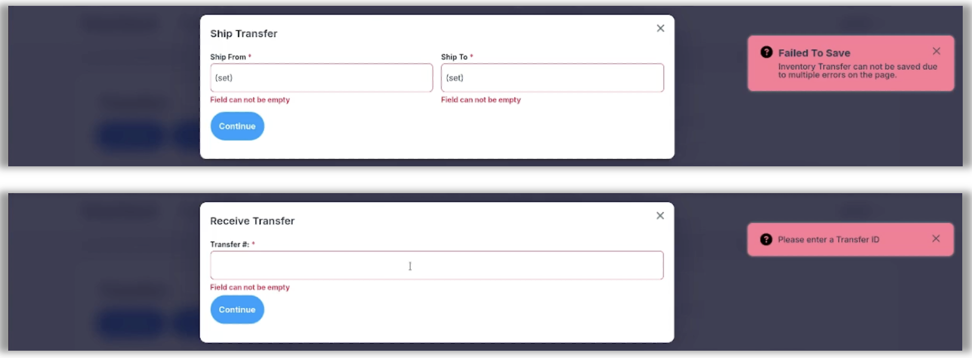 We have made changes to ensure consistency in messaging and field notifications across all inventory transfer modals, including Request, Ship, and Receive. Now, if required fields are left blank, the modal will display a red alert in the upper right corner, and will outline any such fields in red with a notification underneath, as captured in these screenshots: