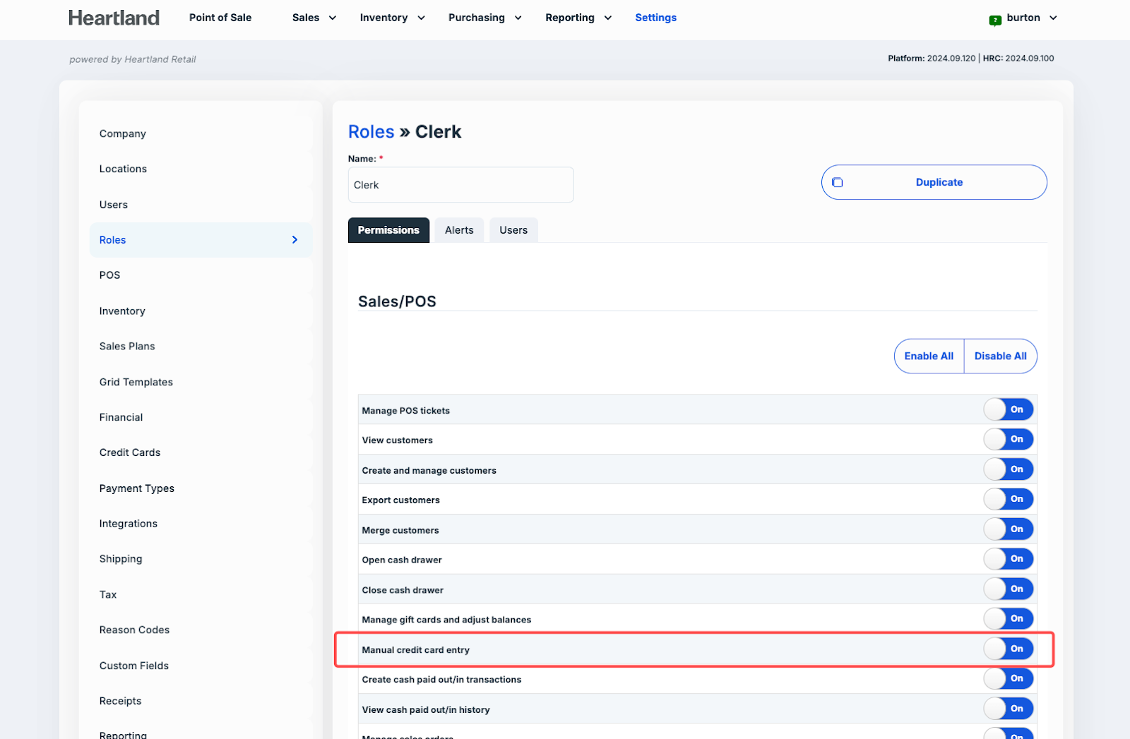 Manual credit card entry setting and toggle it On