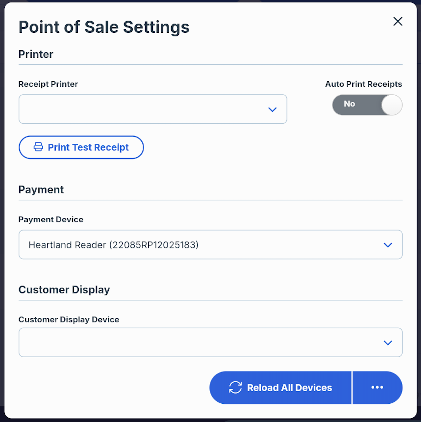 ✅ Open the POS, select the hamburger menu, select Settings, and Reload All Devices