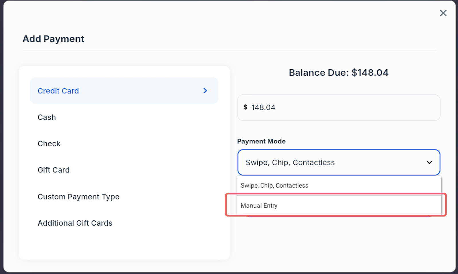 The next time you process a credit card transaction, the Payment Mode drop down list will include the Manual Entry option.