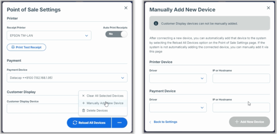 As well, to better support merchants processing with DataCap, in light of device configuration requirements that are difficult to manually enter, we have removed DataCap from the Driver dropdown of the Payment Device section of the Manually Add Device modal. This change affects iOS and web platforms.