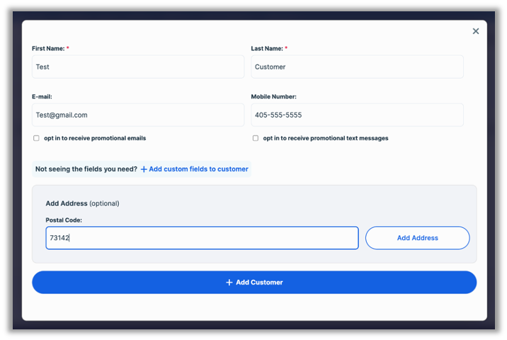 Next, you will fill out the required customer fields and add additional datapo you want to collect. When finished, press the + Add Customer button.