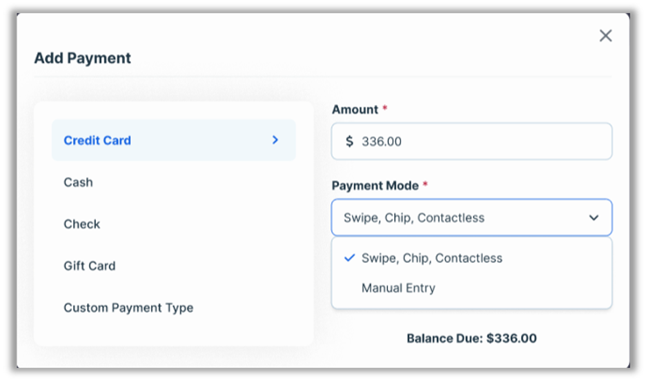 To initiate a manual entry transaction, from the Add Payment window, select Manual Entry from the Payment Mode dropdown list. As previously stated, manual entry should be used only after all other methods of capturing card data (insert/swipe/tap) have failed.