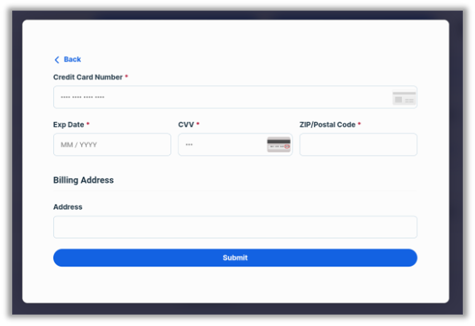 The Heartland Reader will prompt the customer to provide their card to the cashier for manual entry. Enter the card information in the fields provided and tap Submit. As you enter the card number, the POS will check the entry and inform you if it is invalid.