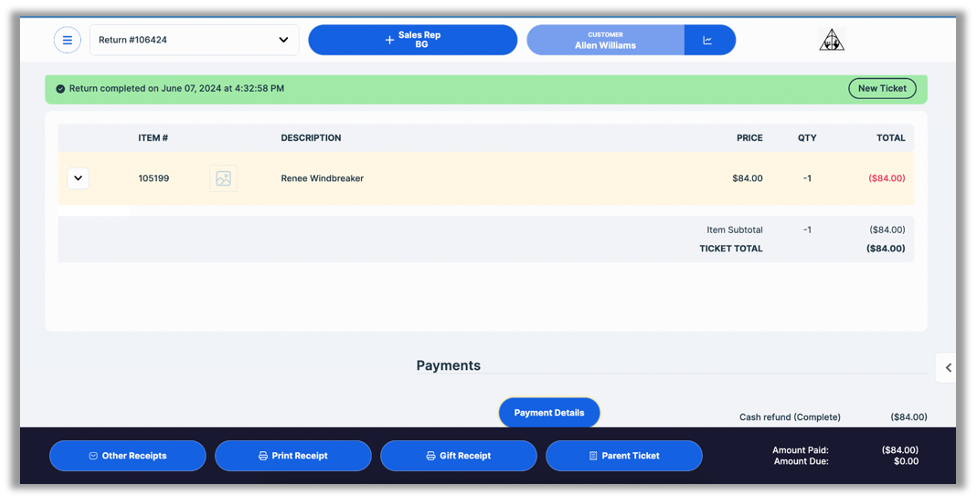 When you have everything entered correctly you can click the Tender button to complete the return and enter the appropriate tender method to refund the customer. Once you complete the return, a green success banner will display.