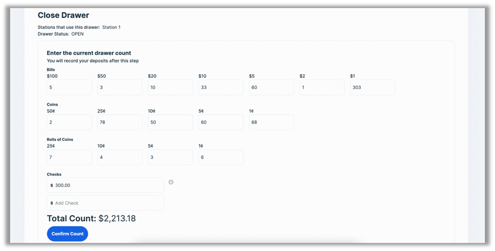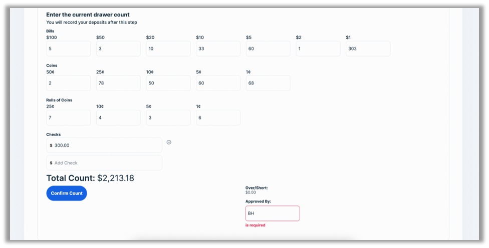 You will be brought to the screen to enter amounts for each denomination of bills and coins, as well as any checks. Once everything looks correct, you will click Confirm Count.