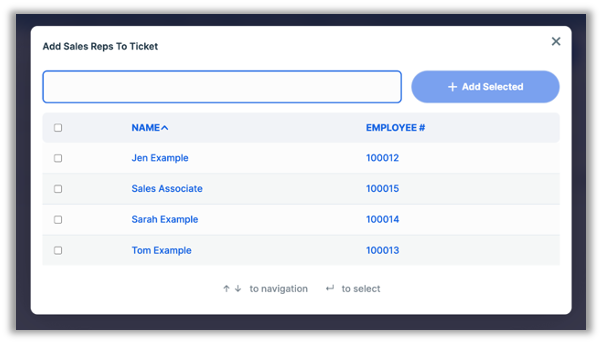 - To split a ticket between two or more sales reps, you can select multiple reps from the dropdown list. This option will evenly split the ticket, including sales reporting, amongst the selected sales reps.