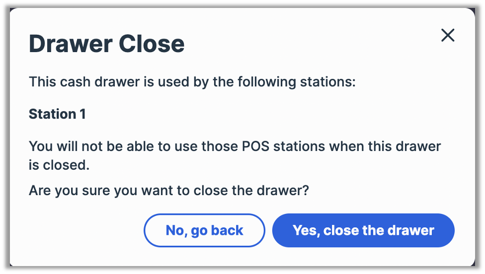 A pop-up confirmation will display to confirm you want to close the drawer. You can either go back or confirm.