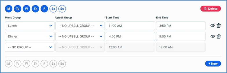 If you click + New, the program will add one set of controls to the area. You can use these controls to set the availability time for one menu group. You can add multiple menu groups (with separate start and end times) to a single week, or you can add multiple weeks, each with different menu groups.