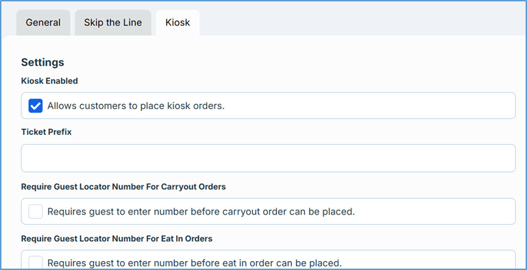 - If you want the Kiosk to receive and process Carryout orders, select the Carryout check box.