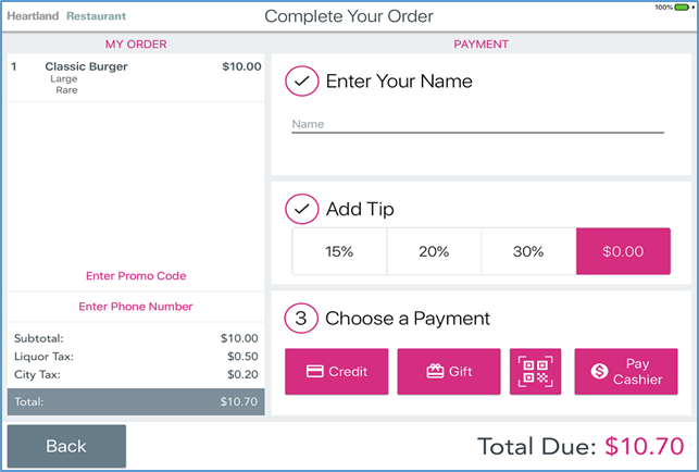 The Kiosk displays the Complete Your Order screen. Depending on how you have configured the Kiosk, the screen will either prompt the customer to either enter a name or to choose a Locator Number. Locator Numbers are used in locations that issue number tents to customers to identify their orders. - In the Enter Your Name box, enter your name.