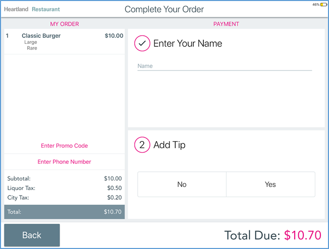 or In the Please Choose a Locator Number list, select your locator number. - In the Add Tip area, tap Yes to add a tip to the order’s total, or No to skip the tip.