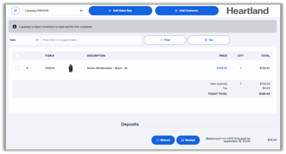 Merchants can now efficiently process refunds for layaway deposits directly back to the original form of payment. To process such a refund, select the Refund button in the Deposits section at the bottom of the layaway screen.