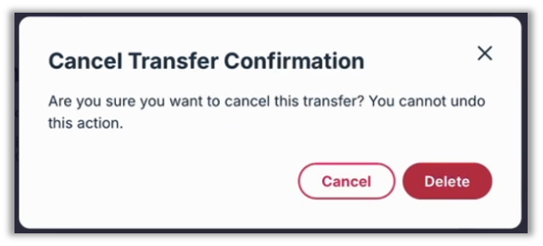 With this release, we implement universal confirmation prompt modals throughout the system. Confirmation modals will always contain two options, one to continue with the initiated action, and the other to cancel. Depending on the action initiated, you will encounter one of two variations of the modal.