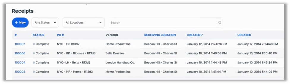 This release introduces additional filter and sort options when viewing purchasing receipts. Filtering options include status and location, which allow you to narrow the results by one or both criteria. These filters can be accessed via the corresponding dropdown menus.