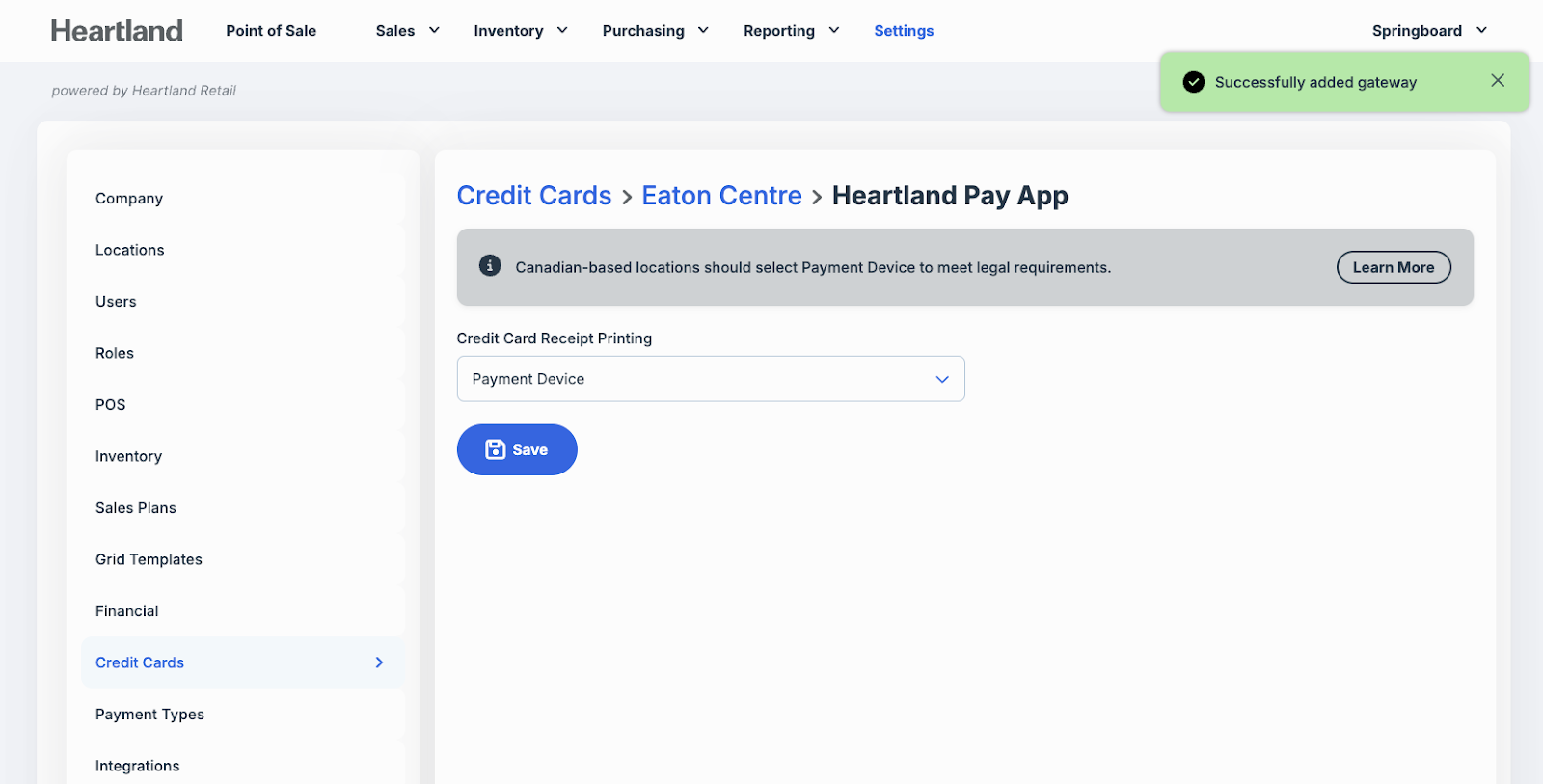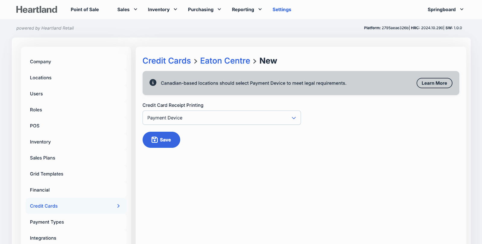 Canadian* locations are presented with a banner recommending Credit Card Receipts be printed from the Payment Device** to meet legal requirements. Press Save.