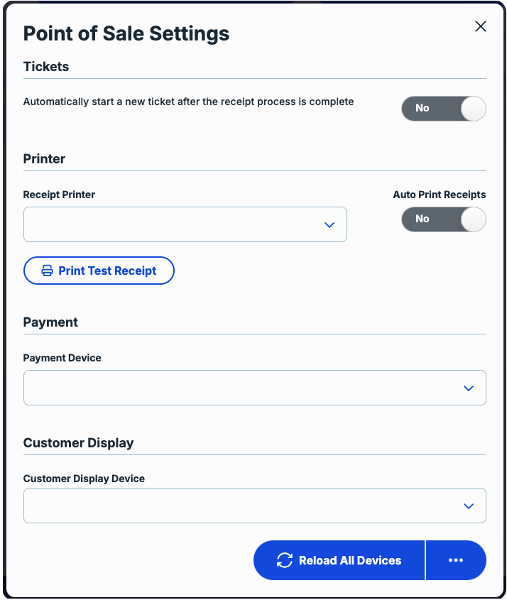 Select your payment device from the Payment Device dropdown and from the Customer Display Device dropdown.