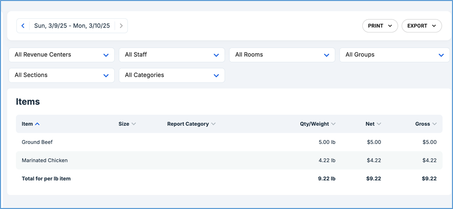 We have modified the Admin Console to display weights as quantities for weighted menu items in its various reports. In previous versions, the Admin Console listed the quantities of weighted items as whole numbers (without decimals), which did not display their weights. When listing weighted menu items, the Admin Console now displays their quantities as weights, rounded to the second decimal (such as “2.25 oz”). To align with this change, we have also relabeled the quantity (Qty) column as Qty/Weight. When listing the weight of such items, the Admin Console includes the item’s unit of measurement (pound, ounce, kilogram, and so on). It also groups items and separates totals by their unit types.