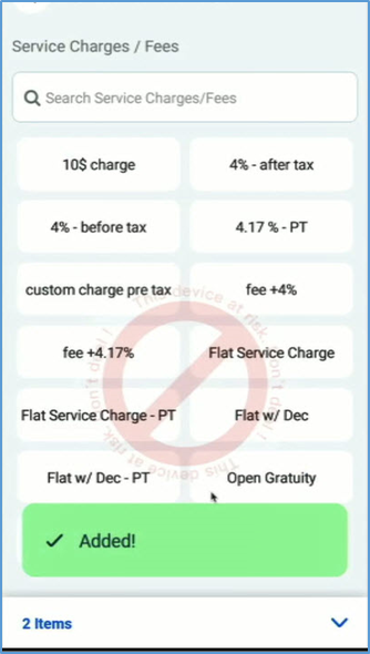 In the Mobile 2.0 POS, we have added a visual notification to the Discounts and Charges/Service Fees screens. In either of these screens, when you add a discount or a charge to a ticket, the POS now displays a green notification (Added!) at the bottom of the screen to verify at the discount or charge was added successfully.