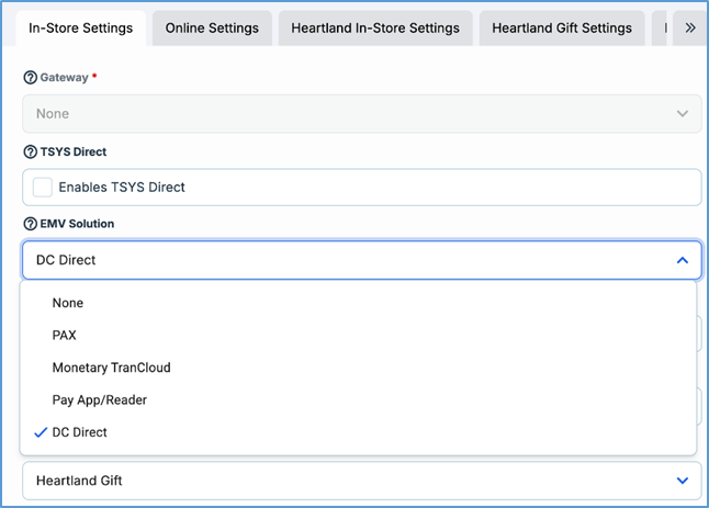 - In the Payment Gateway screen, in the In-Store Settings area, click DC Direct in the EMV Solution list.