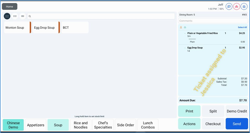 After you tap Send, the POS will display the Ticket screen, and the ticket panel now displays controls for accessing its separate tabs.