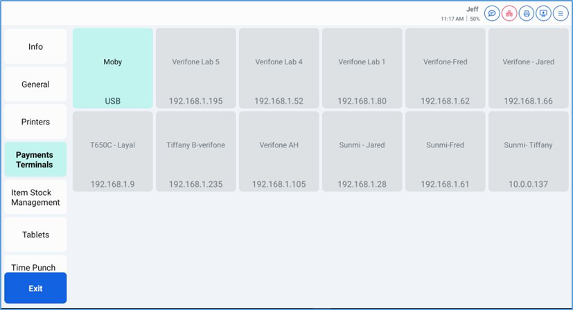 The Payment Terminals screen enables you to set up payment terminal (such as a Verifone card reader device) to each NextGen POS station. The Payment Terminals screen displays a list of tiles, each representing a payment terminal on the location’s network. Terminals available to your current device display in light green.