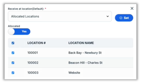 In order to use this new functionality, when selecting the Receive at Location for a PO, you must set Allocated to Yes and then check the desired locations from the list.