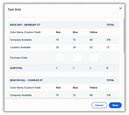 The following modal will display, including the available quantities (both company and location). From this page, enter allocation values for each location as needed.