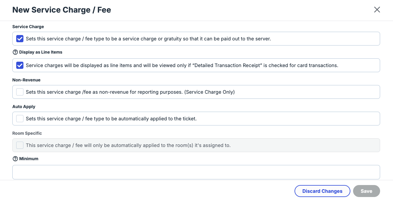 We have added the Display as Line Items check box to the Service Charges/Fees screen. In the Admin Console's Main Menu, click Menu, then click Service Charges/Fees. In the Service Charges/Fees screen, click New. In the Settings panel, if you select the Service Charge check box, the program now displays the Display as Line Item check box. If you select this check box, the POS will display service charges as line items within a ticket (above the subtotal), and it will only display them if the location has enabled the Detailed Transaction Receipt feature for the room. If you clear this check box, the POS will print or display service charges under the transaction details in its receipts.