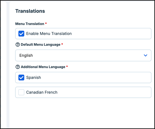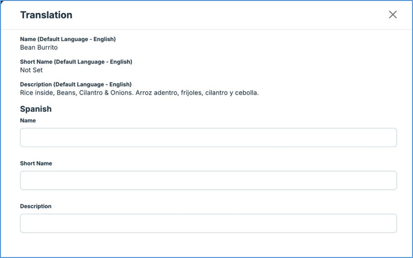 Currently, supported languages for translation are French and Spanish. While other languages may be considered in the future, they are not supported at this time. When a customer uses a Kiosk or Online Ordering and selects a supported language (for example, French), the menu items will automatically appear in French, provided you have entered the translations.