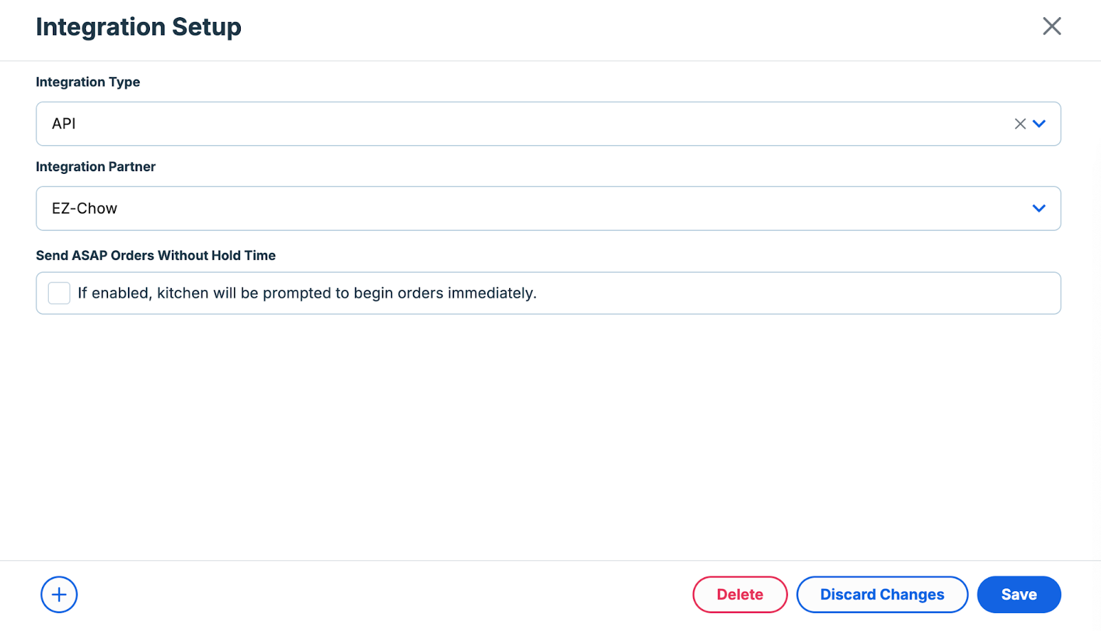 In the Admin Console's Main Menu, click Integrations. In the Integrations screen, click New. In the Integration Setup panel, in the Integration Type list, select EZ-Chow. In the settings for the EZ-Chow integration, we have added the Send ASAP Orders Without Hold Time check box. If you select this check box, the POS will remove the hold times from online orders received from the EZ-Chow service. If a customer specifies preparing the order as soon as possible, the program will prompt the kitchen to begin preparing the item immediately.