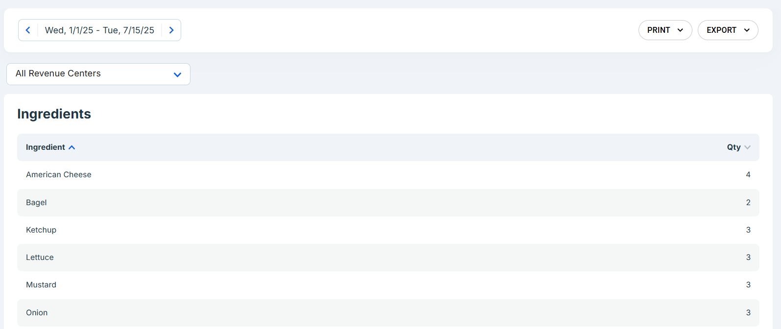 You can now filter the Ingredients Reports by revenue center. In the Admin Portal's Main Menu, click Reports, then click Ingredients. In the Ingredients Report screen, we have added the Revenue Centers list. If you select a revenue center in this list, the program will filter the report to only include ingredients associated with that revenue center. If you select All Profit Centers (its default setting), the program will include ingredients from all revenue centers. (The Revenue Centers list is only visible if the account has existing revenue center records.)