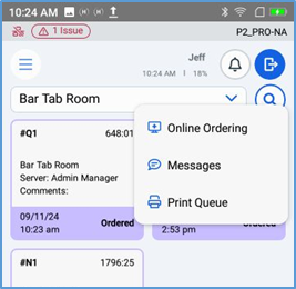 Notifications: This button displays a menu, providing access to the Online Ordering screen, the Messages screen, and the Print Queue.