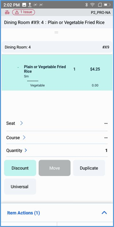 In any item’s modifier screen, if you tap Item Actions, the POS opens the Item Actions panel at the bottom of the screen. This panel includes a preview of the item as it will appear in the ticket, as well as controls to edit the item’s seat number and quantity.