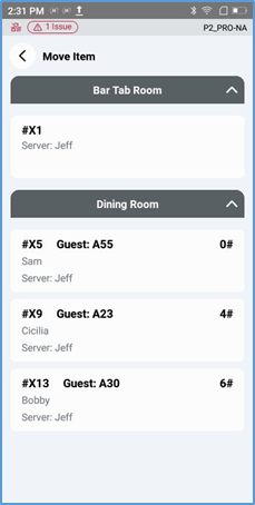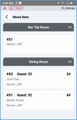 In the Room screen, if you access a room that uses tabs, the POS displays the room without a table layout. Instead, it lists all occupied tables in the room as a list of tiles, each displaying the table’s number, status, current server, the time it was opened, and the amount of time it’s been occupied.