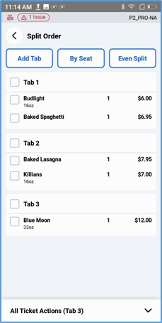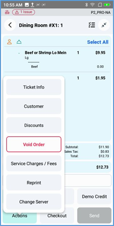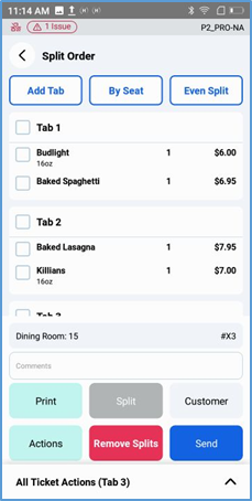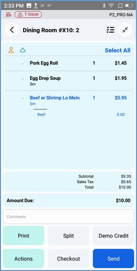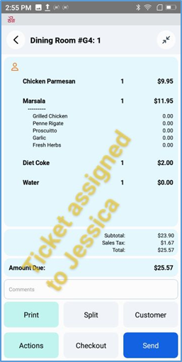 In a thin panel below the ticket display, the POS displays the ticket’s current amount due. It also displays buttons for certain critical actions (Print, Checkout, and Send), but you must tap Actions to access most action options.