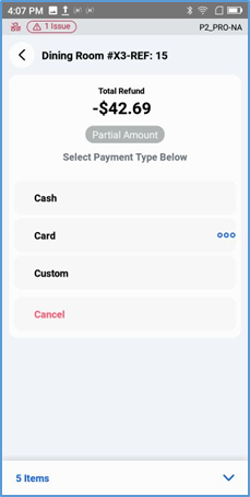 Once you select a payment type, the POS processes the refund with the selected payment type, then displays a screen verifying its approval.