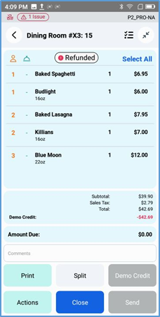 To remove a paid ticket from the Room screen, access the ticket. In the Ticket screen’s Actions menu, tap Close.